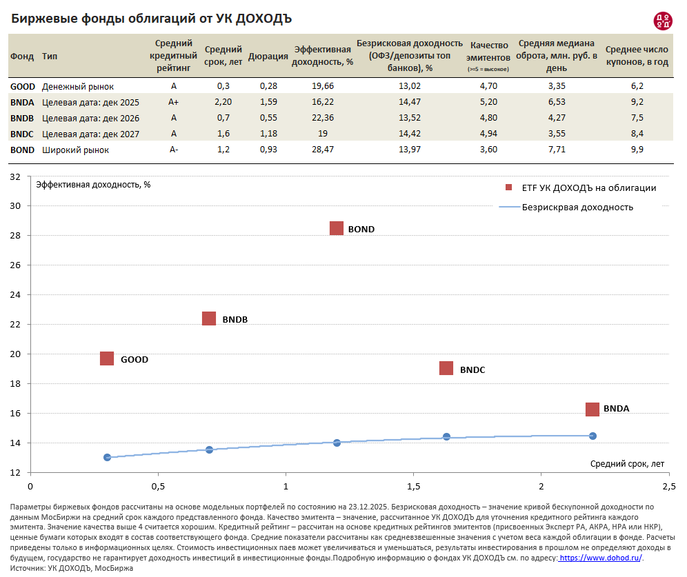 В таблице и на графике ниже представлены основные параметры всех наших биржевых фондов облигаций по состоянию на 23 декабря 2025 года - от средних сроков и эффективных доходностей к погашению, до среднего качества и рейтинга эмитентов. Текущие доходности ОФЗ и банковских депозитов на сопоставимые сроки приведены в столбце "Безрисковые доходности" и отдельной кривой доходностей на графике.