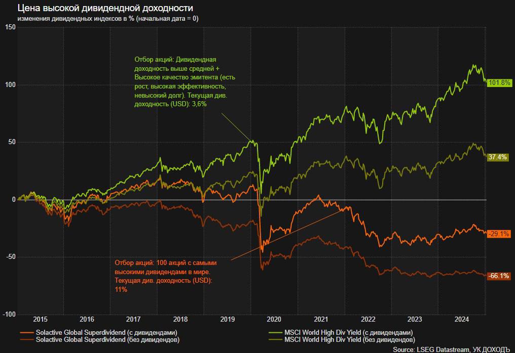 14. Цена акций компаний с очень высокой дивидендной доходностью, как правило, почти не растет (см. график ниже). Это происходит, потому что такие компании почти ничего не реинвестируют (из-за низкой доходности) и их выручка не увеличивается в долгосрочном периоде.