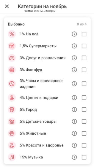 Категории на ноябрь по бесплатной дебетовой карте банка "Синара". У всех одинаковый набор.