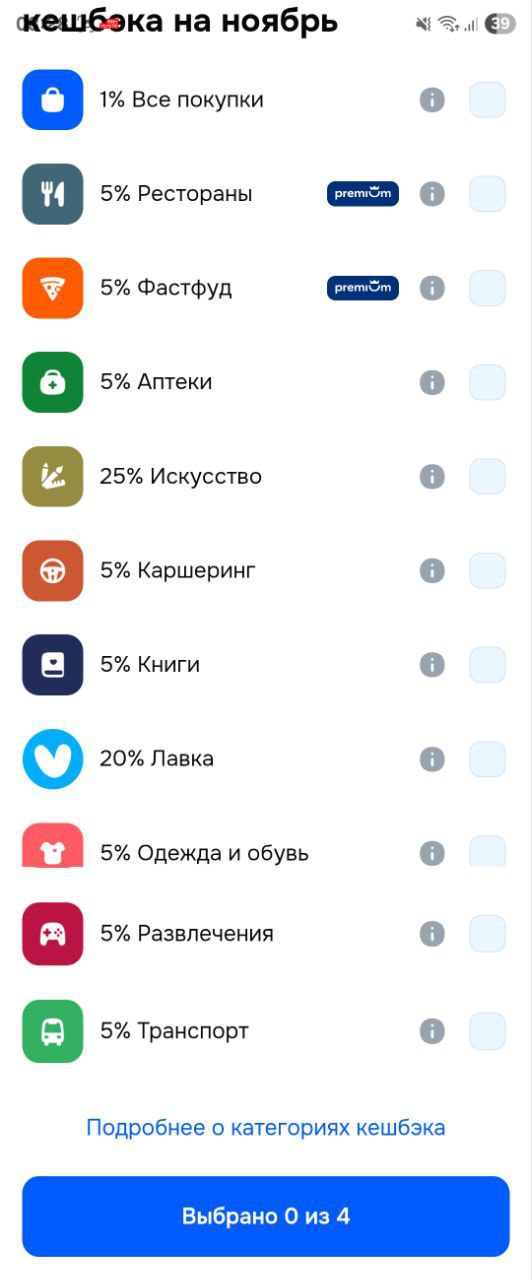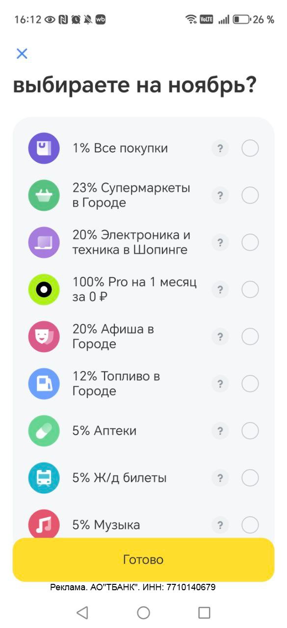 В "Т-Банке" тоже доступен выбор повышенных категорий кэшбэка на ноябрь (у всех разные, большой кэшбэк обычно предлагаются только за покупки в сервисах самого "Т-Банка").