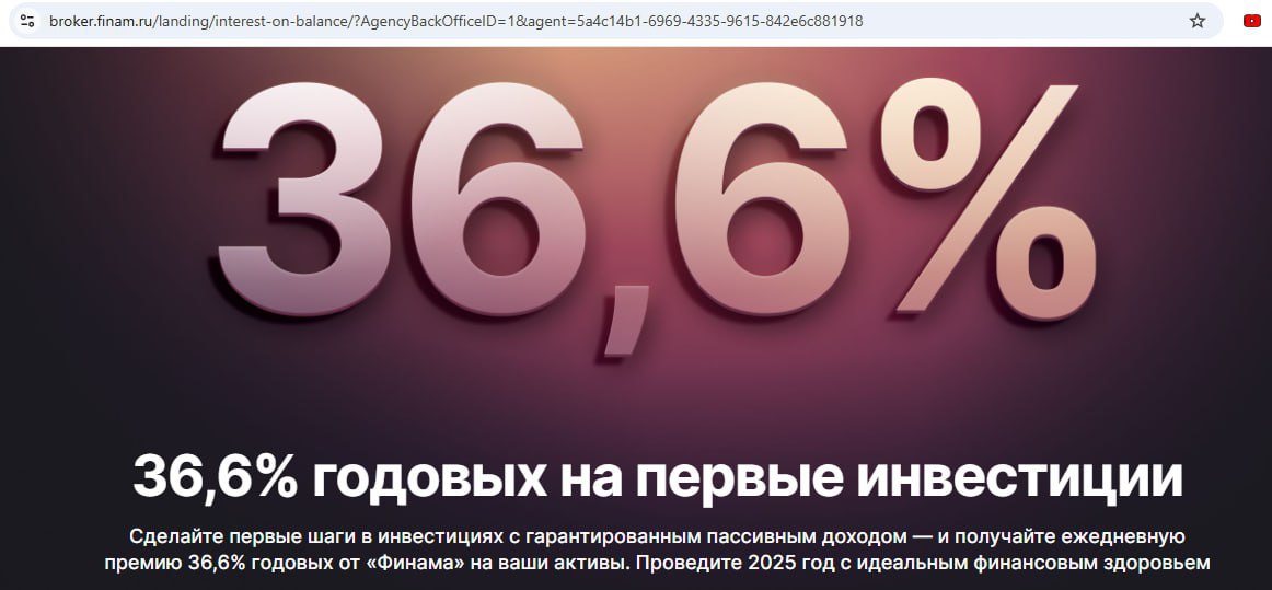 36,6% годовых на остаток на брокерском счете в "Финаме" от 300 000 до 3 млн руб. по акции для новичков в первые 30 дней. Акцию продлили на год.