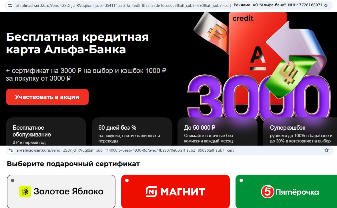 Сертификат на 3000 руб. в Магнит / Пятёрочку / Золотое Яблоко и кэшбэк 1000 руб. за кредитную карту "Альфа-Банка" со снятием наличных и кэшбэком. Акция от другого партнёра с другими сертификатами.