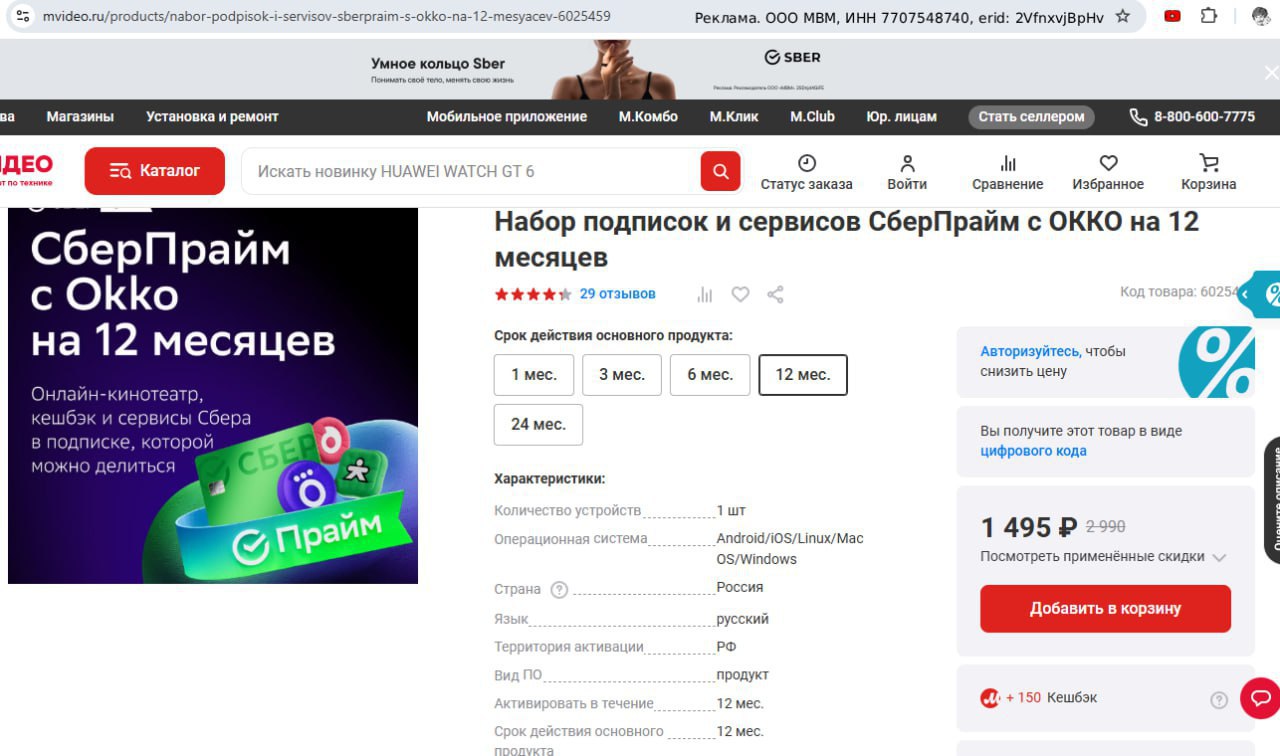 На сайте "М.Видео" в этом разделе сейчас предлагают подписку "СберПрайм" на 12 месяцев за 1495 руб. (обычная её цена 299 руб./мес.).