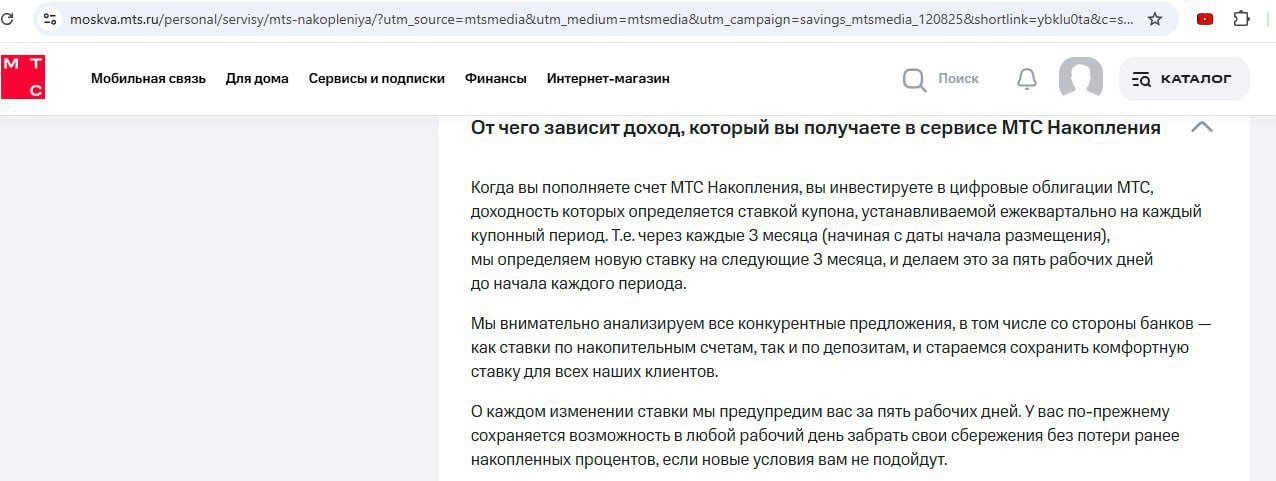 ▶️ Сервис бесплатен, минимальная сумма пополнения 100 руб. (лучше пополнять с карт "МТС Банка" (+1000 руб. за оформление карты МТС Деньги), для сторонних банков МСС 6538, можно попасть на комиссию за донорство). Когда вы пополняете счёт "МТС Накоплений", деньги автоматически инвестируются в цифровые облигации "МТС".
