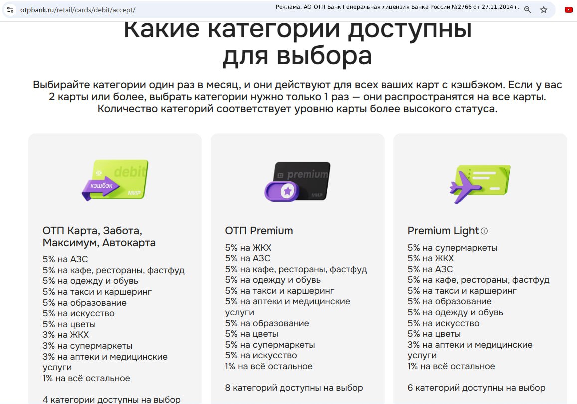 Список доступных категорий с 5% кэшбэка у всех одинаковый (единственное, в категориях "Супермаркеты", "Аптеки/Медицина", "ЖКХ" на уровне "ОТП Карты" не 5%, а 3%):