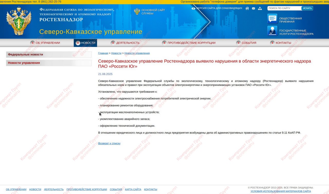 21 августа «Ростехнадзор» снова вынужден был выйти с официальным сообщением: ПАО «Россети Юг» во второй раз за месяц поймано на системных нарушениях. Формулировки — жесткие: провал в обеспечении надежности электроснабжения, хаос с планированием ремонтов, бардак в эксплуатации маслонаполненных устройств, отсутствие аварийного запаса и липовая документация.