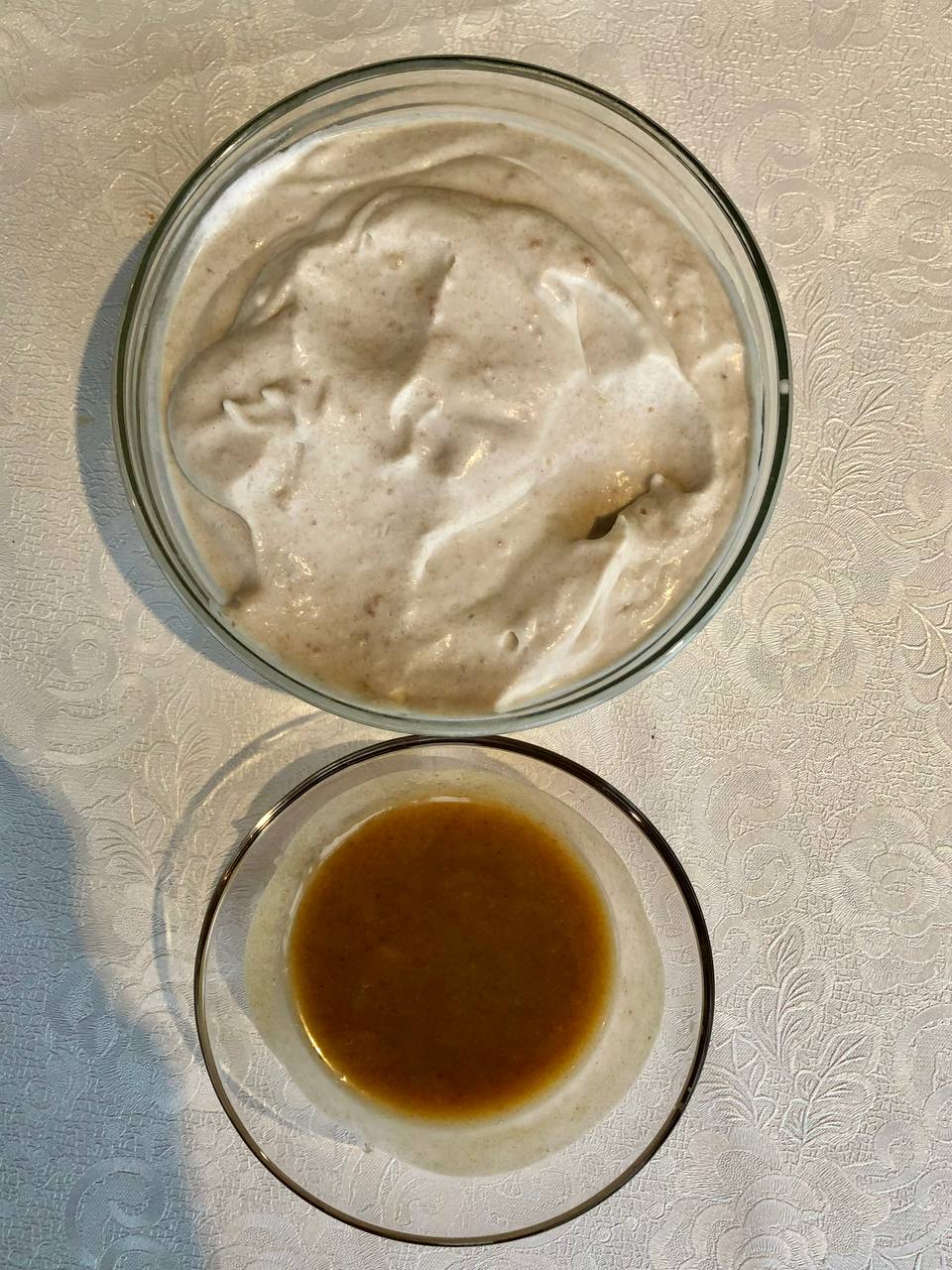 Взял 100 гр очищенных (кожа отходит прекрасно) сухофруктов, смешал с небольшим количеством воды и соли. Взбил в блендере и разбавил кленовым сиропом для цвета. В интернетах для этой цели используют сироп бурого риса.