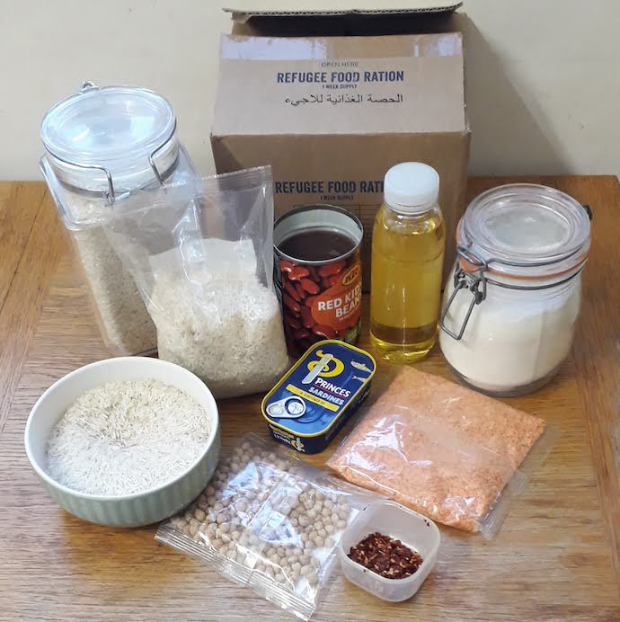 420 гр риса, 170 гр чечевицы, 85 гр нута, 400 гр консервированных бобов, 125 гр сардин в банке, а также купоны на 300 гр растительного масла и дополнительные 1,5 кг риса и 400 гр муки. И это весь рацион на неделю. Ни соли, ни специй, ни чая, ни-че-го.