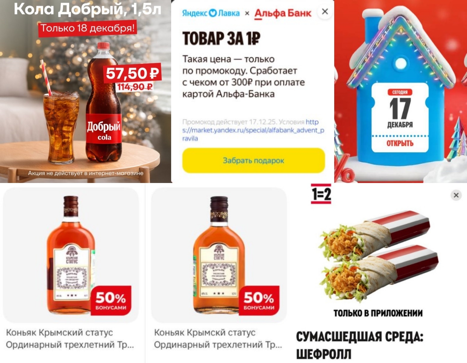 ▫️ Можно получить один товар из специальной подборки всего за 1р, если оформишь заказ на сумму от 300р и оплатишь его картой Альфа-Банка. Для этого сначала нужно перейти по ссылке, чтобы открыть календарь акций от Яндекс Маркета и получить там свой индивидуальный промокод для Лавки, затем в приложении Яндекс Лавки добавить товары в корзину на сумму от 300р, в корзине найти раздел «Ваши промокоды», активировать полученный код и выбрать товар из открывшейся подборки - его цена изменится на 1.