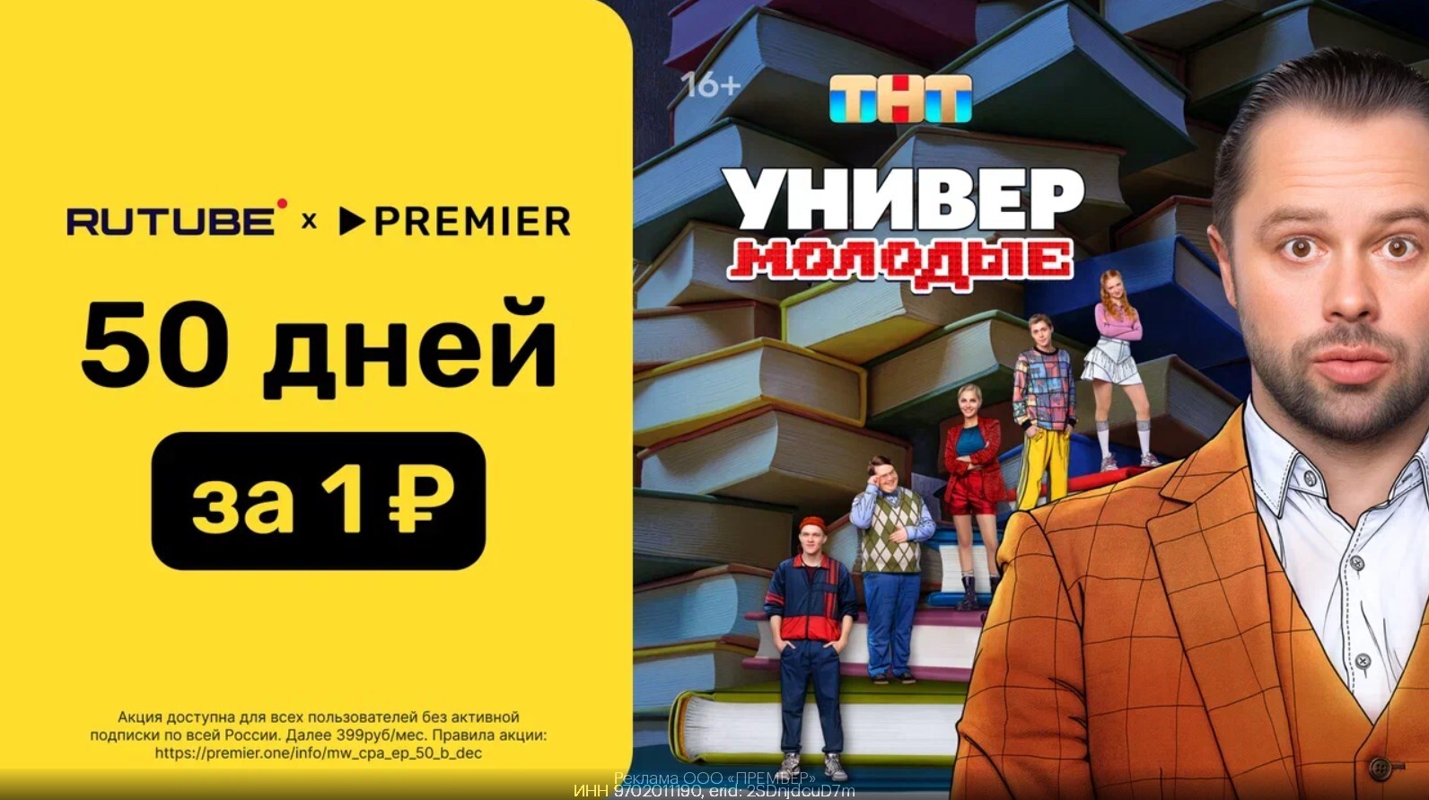 Получите единую подписку на два сервиса - онлайн-кинотеатр PREMIER и RUTUBE на 50 дней всего за 1 рубль по промокоду для всех, у кого нет активной подписки. Она даёт доступ к огромной библиотеке сериалов и фильмов без рекламы.