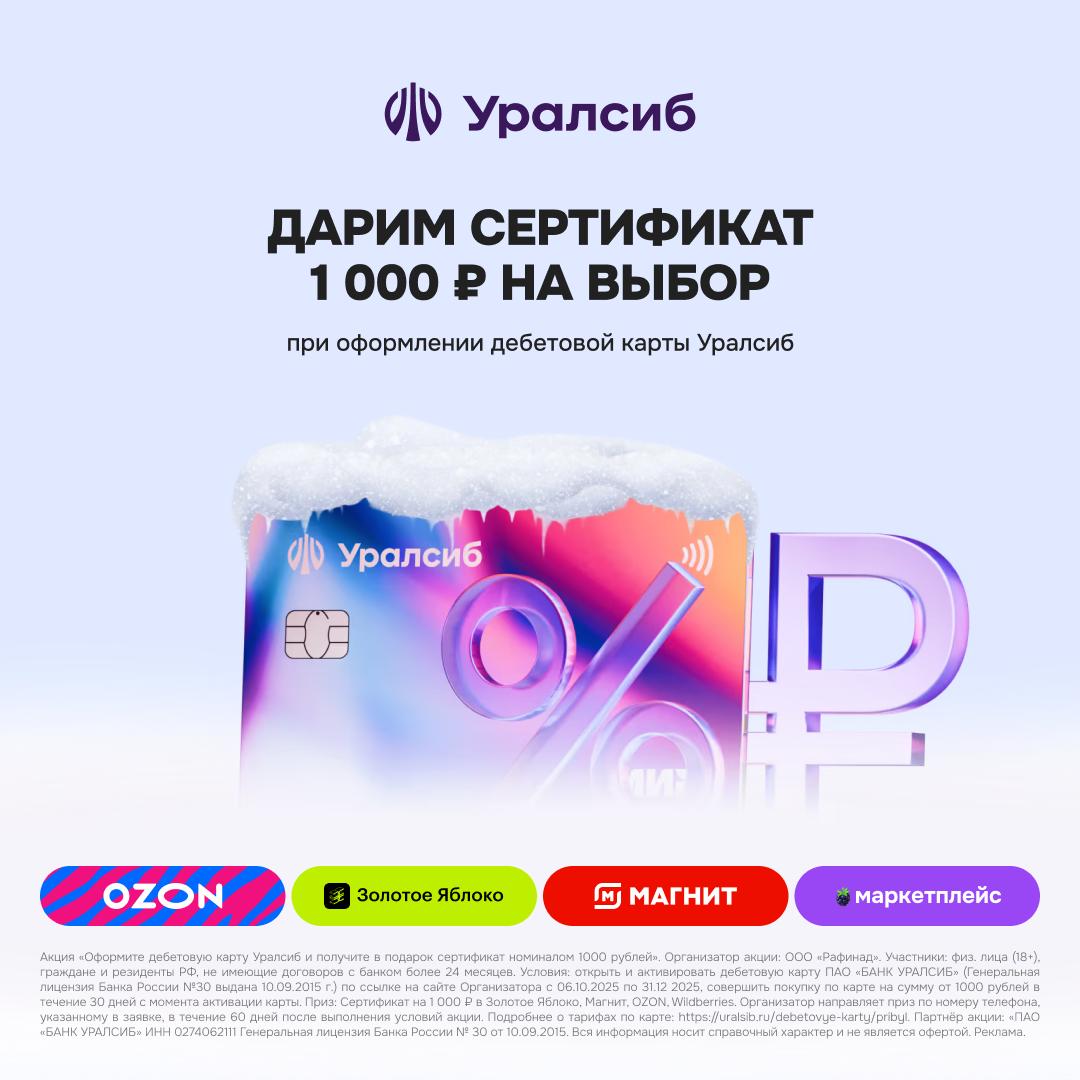 💳 Банк Уралсиб: получи сертификат 1000р за оформление карты