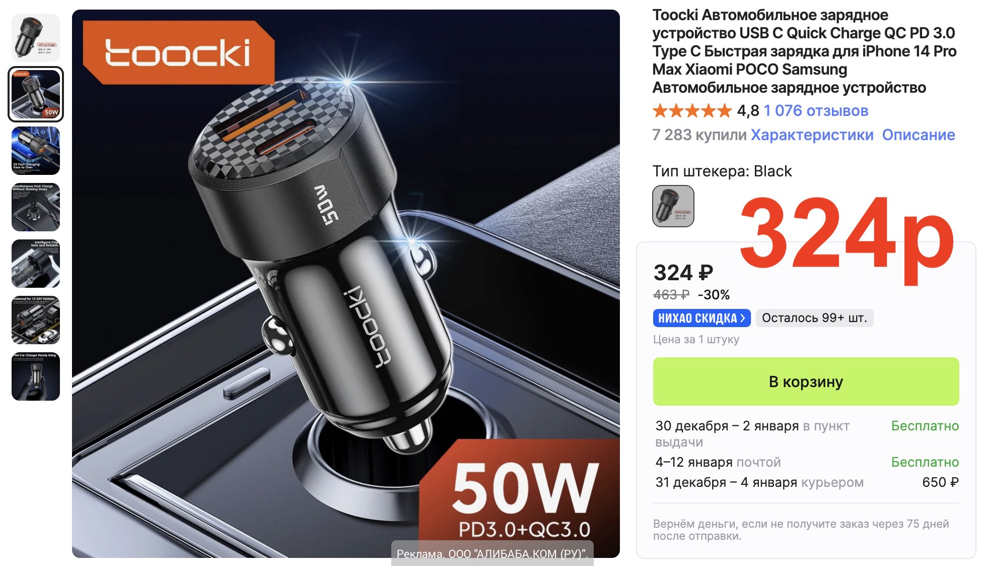 💥 Автомобильное зарядное устройство Toocki, 50 Вт за 324р