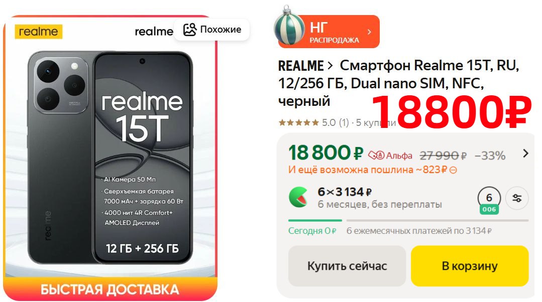 • Яндекс Маркет - смартфон Realme 15T, 12/256 Гб за 18800р: