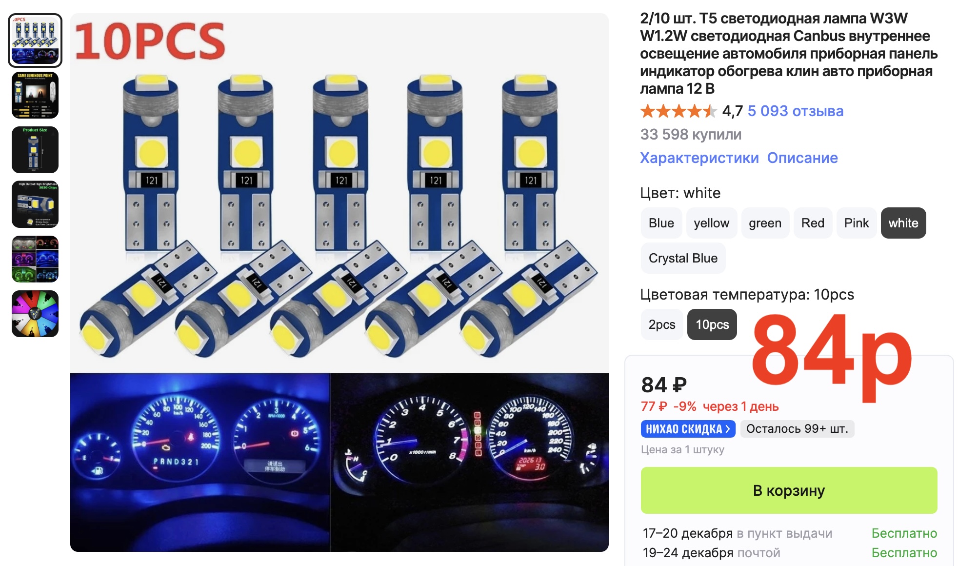 Отличный вариант для габаритов и подсветки номера. На выбор представлены лампы с 7 цветами испускаемого света. Куча положительных отзывов и заказов. Забирай смело!