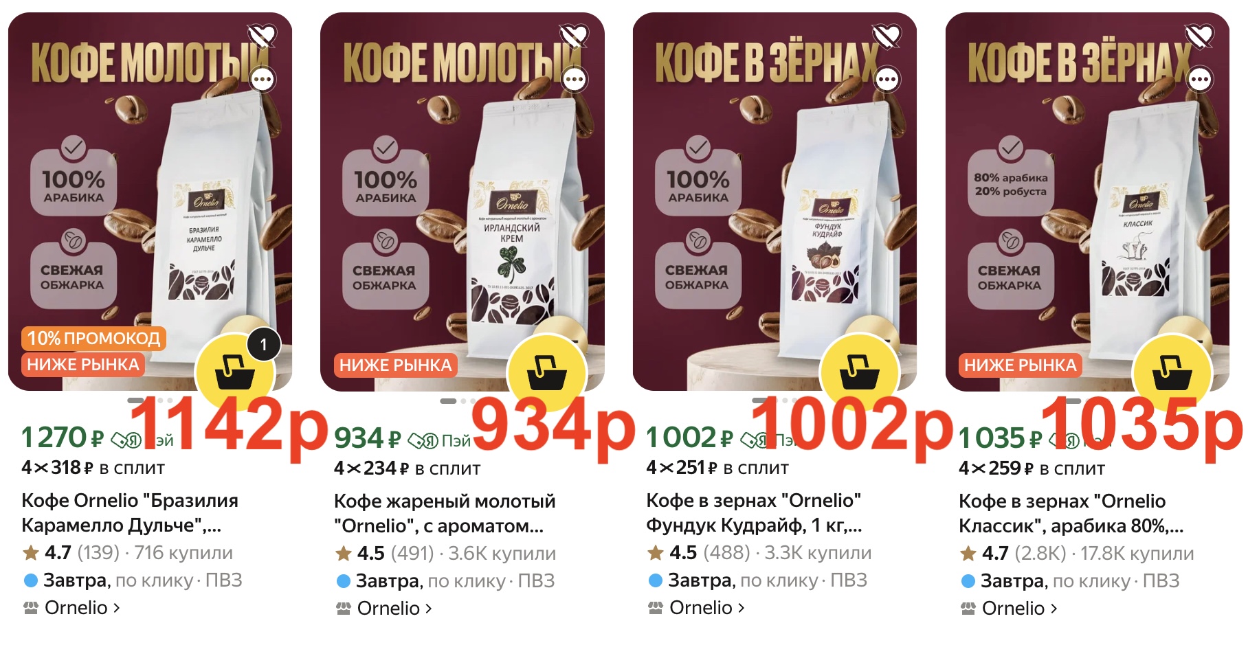 Доп.скидка 10% по коду на кофе Ornelio с Яндекс Маркет