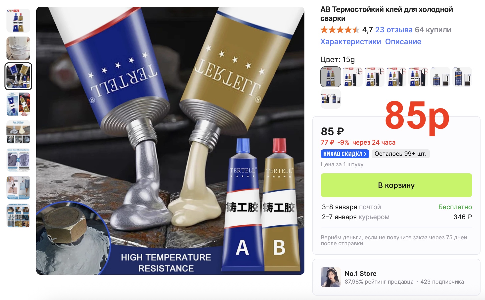 💥 Термостойкий клей AB для холодной сварки за 85р