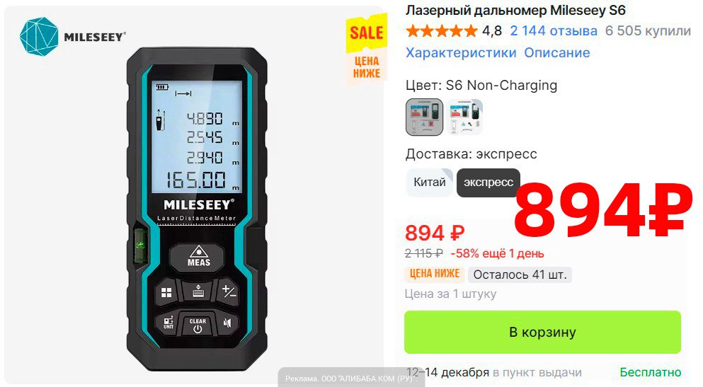 Классная цена! Полезный прибор в строительстве и ремонте. Дальность измерений 40 м, может вычитать, складывать, а также рассчитывать объём и площадь, корпус из ударопрочного пластика, LED-дисплей с подсветкой, питается от батареек ААА. Можно брать!