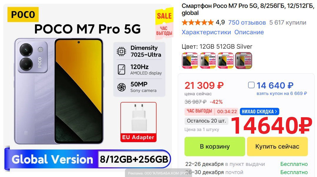 • AliExpress - смартфон Poco M7 Pro 5G, 12/512ГБ за 14640р: