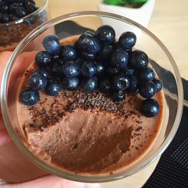 2. Кефир смешать с какао, добавить подсластитель, желатин и взбить блендером.