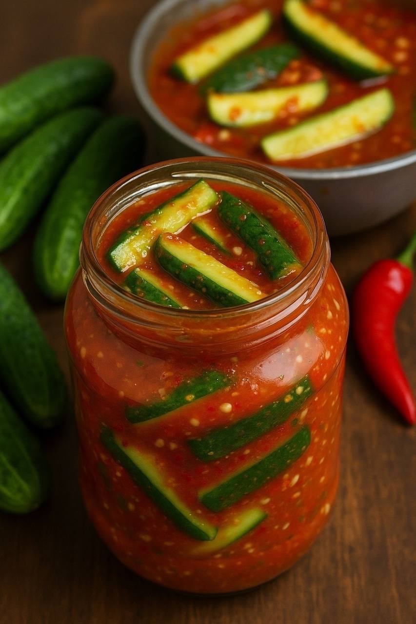 Огурцы в острой аджике — это очень вкусное и лёгкое в приготовлении блюдо.