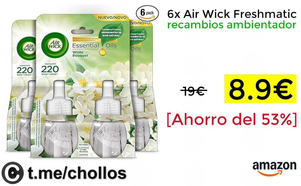 ✨A precio de chollo este pack con 6 recambios de ambientador Air Wick Freshmatic, cada uno con fragancia que dura hasta 110 días. Con aroma a White Bouquet.