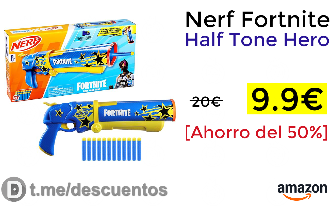 ✨Muy buen precio para este lanzador Nerf Fortnite Half Tone Hero, inspirado en el popular videojuego, gran cañón frontal y capacidad para 6 dardos y sistema de recarga manual, incluye 12 dardos de espuma en tonos azul y amarillo, compatibles con otros lanzadores Nerf Fortnite y Nerf Elite.