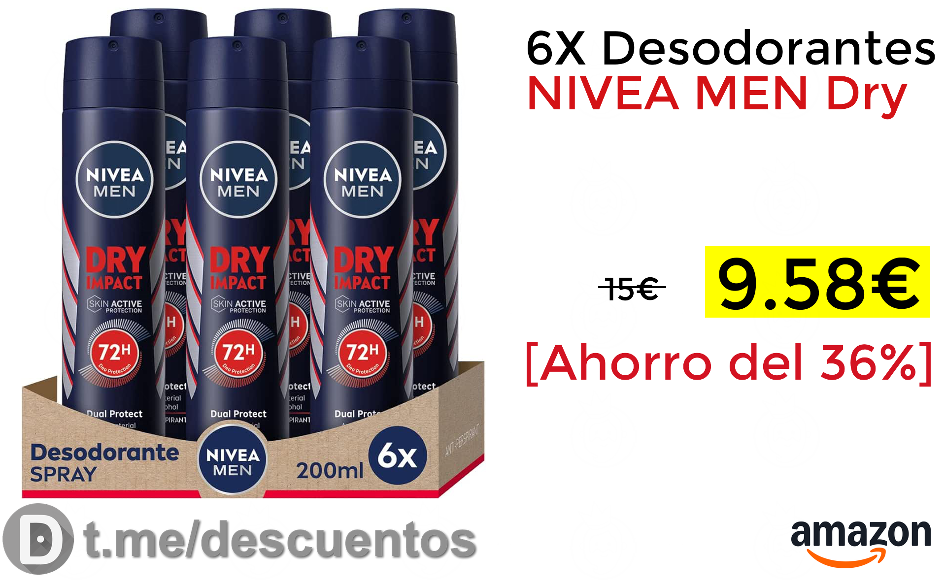 ✨Buen precio con compra recurrente para este pack de 6 desodorantes para hombre Niven Men Dry Impact con protección hasta 72 horas y válido para todo tipo de pieles ya que no contiene alcohol, parabenos ni conservantes.