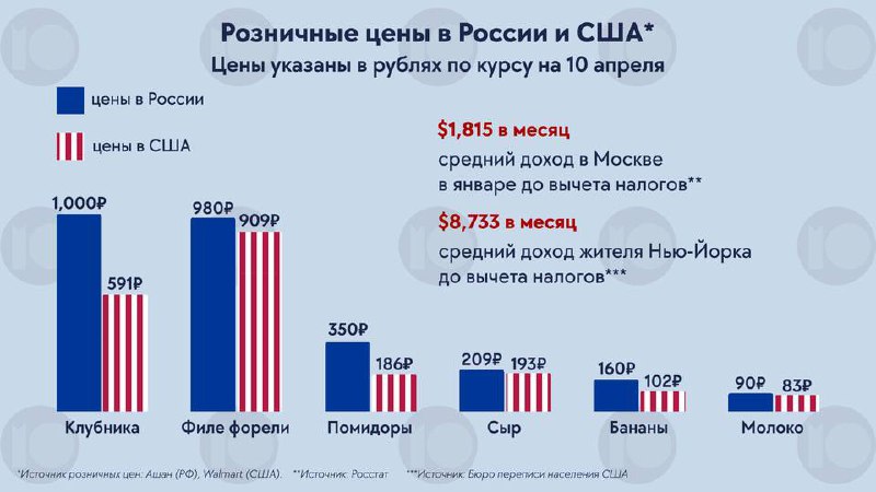 По официальным данным, в Москве средний доход составляет около 180 тысяч рублей в месяц, а в Нью-Йорке — примерно 625 тысяч рублей ($6500) в месяц. Очевидно, что покупательная способность жителей Нью-Йорка значительно выше. Кроме того, в Америке есть города с гораздо более доступными ценами, хотя средняя зарплата по стране сильно не отличается.