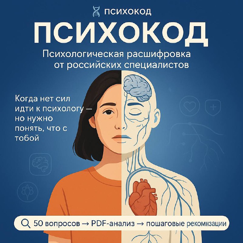 Просто однажды ловишь себя на мысли: “А кто я вообще? Чтомне нравится? Почему я ничего не хочу?” ❌ Так и живут десятки тысяч девушек. На автопилоте. С фразой “ничего, пройдёт”. Пока не становится поздно. 👉 Пора вернуть себя. 🧬 ПСИХОКОД — это твой первый шаг назад к себе настоящей. Без эзотерики. Без соплей. Без “ты особенная”. 🧬 Что такое ПСИХОКОД? ПСИХОКОД — это профессиональный инструмент психологической самодиагностики, созданный в России командой из 10 клинических специалистов: • психологов, психотерапевтов, нейропсихологов и врачей • с опытом практики от 10 до 20 лет • на основе сотен реальных терапевтических кейсов Проект разработан, чтобы дать доступ к глубокой, честной и научно обоснованной психологической помощи тем, кто не может позволить себе терапию или н