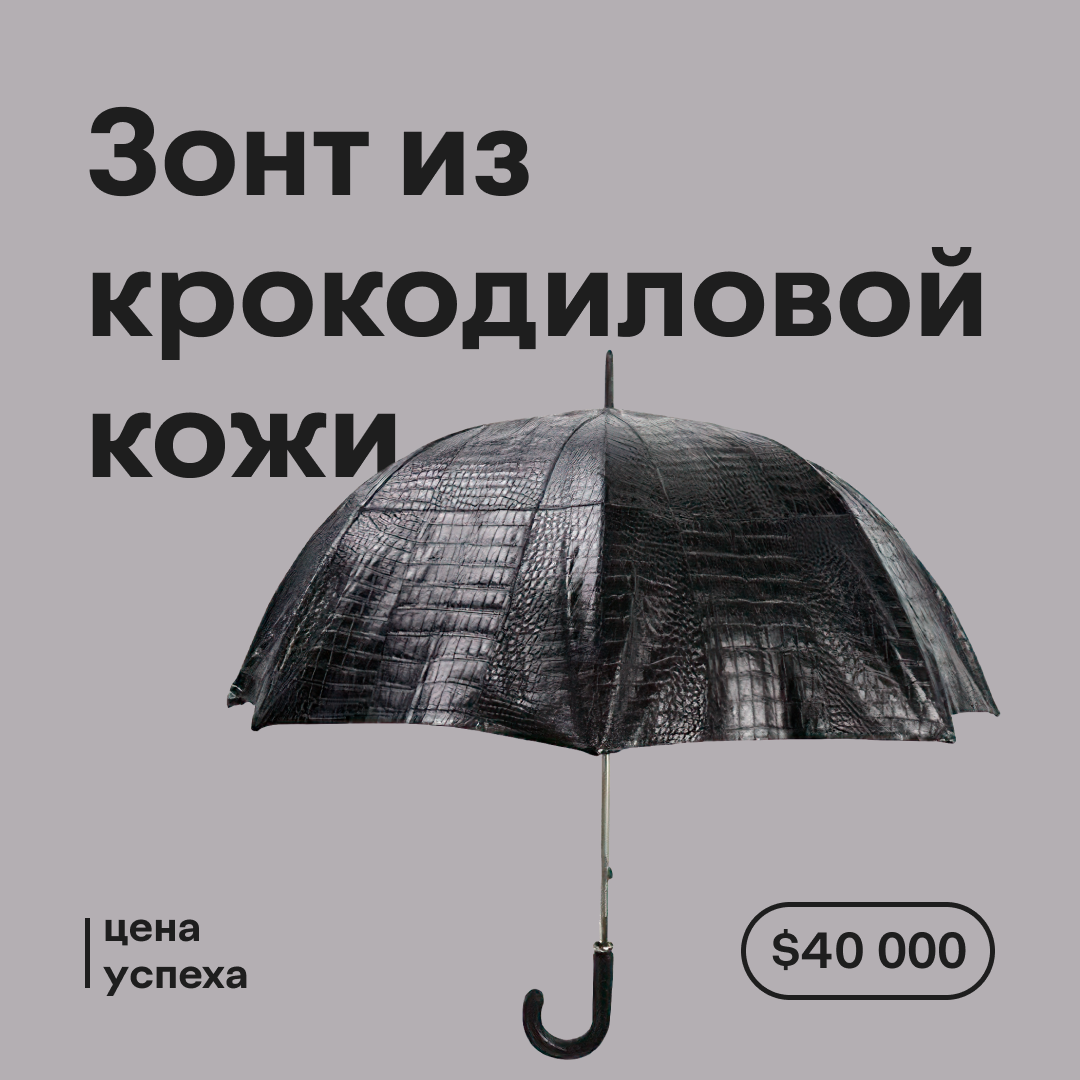 Зонт из крокодиловой кожи. Такую модель предлагает итальянский бренд Billionaire Couture. Зонт чёрного цвета защитит владельца и от дождя, и от ветра, но за это удовольствие придётся выложить 40 000 долларов.