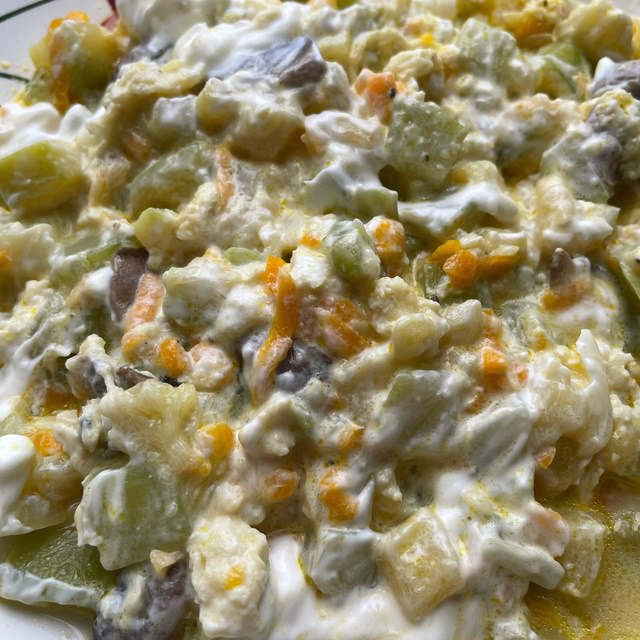 5. Майонез смешать с горчицей и заправить салат. количество горчицы зависит от Вашего отношения к этой приправе. Майонез не кладите много.