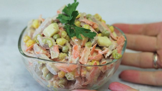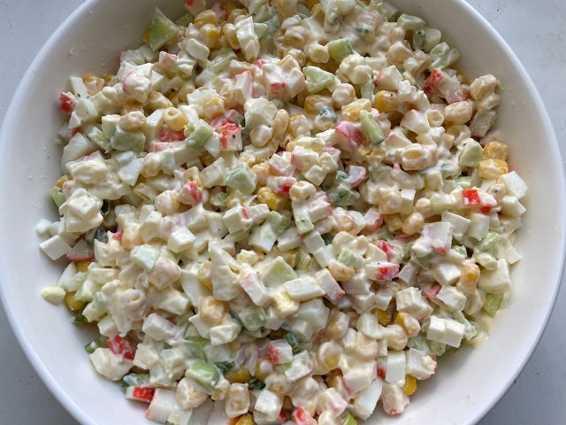 4. Далее добавляем пол банки кукурузы и пол банки горошка. Солим и перчим. Заправляем майонезом.