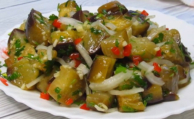 1. Баклажаны очищаем полосками - зеброй. Такой способ позволяет придать блюду необычный внешний вид. Режим их на небольшие кусочки.