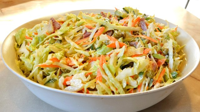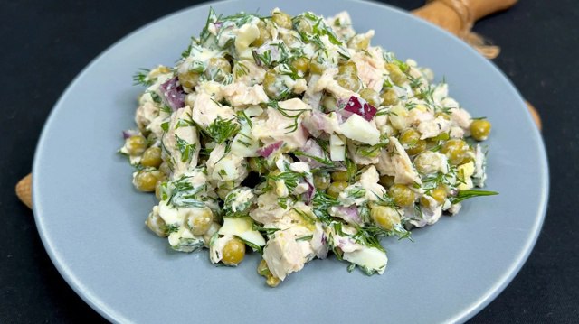 4. Дополняйте салат зеленым консервированным горошком. Только не забывайте слить жидкость.