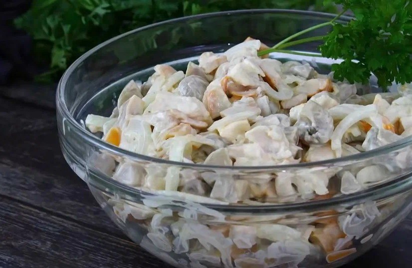 Салат получается очень нежным, сочным, с приятной кислинкой маринованного лука. Курица и грибы всегда беспроигрышный вариант.