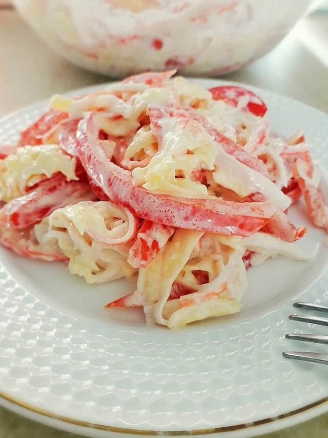 1. Крабовые палочки и болгарский перец нарежьте тонкой соломкой.