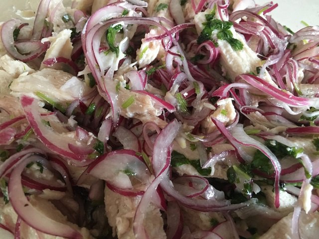 1. Лук нарезаем полукольцами, обдаем кипятком на пару секунд и быстро промываем в холодной воде. Это позволит избавится от лишней горечи и сохранить его слегка хрустящую структуру. Затем добавляем сахар, чуть-чуть соли, черный молотый перец и уксус. Все хорошо перемешиваем и оставляем настояться, пока готовим остальное.