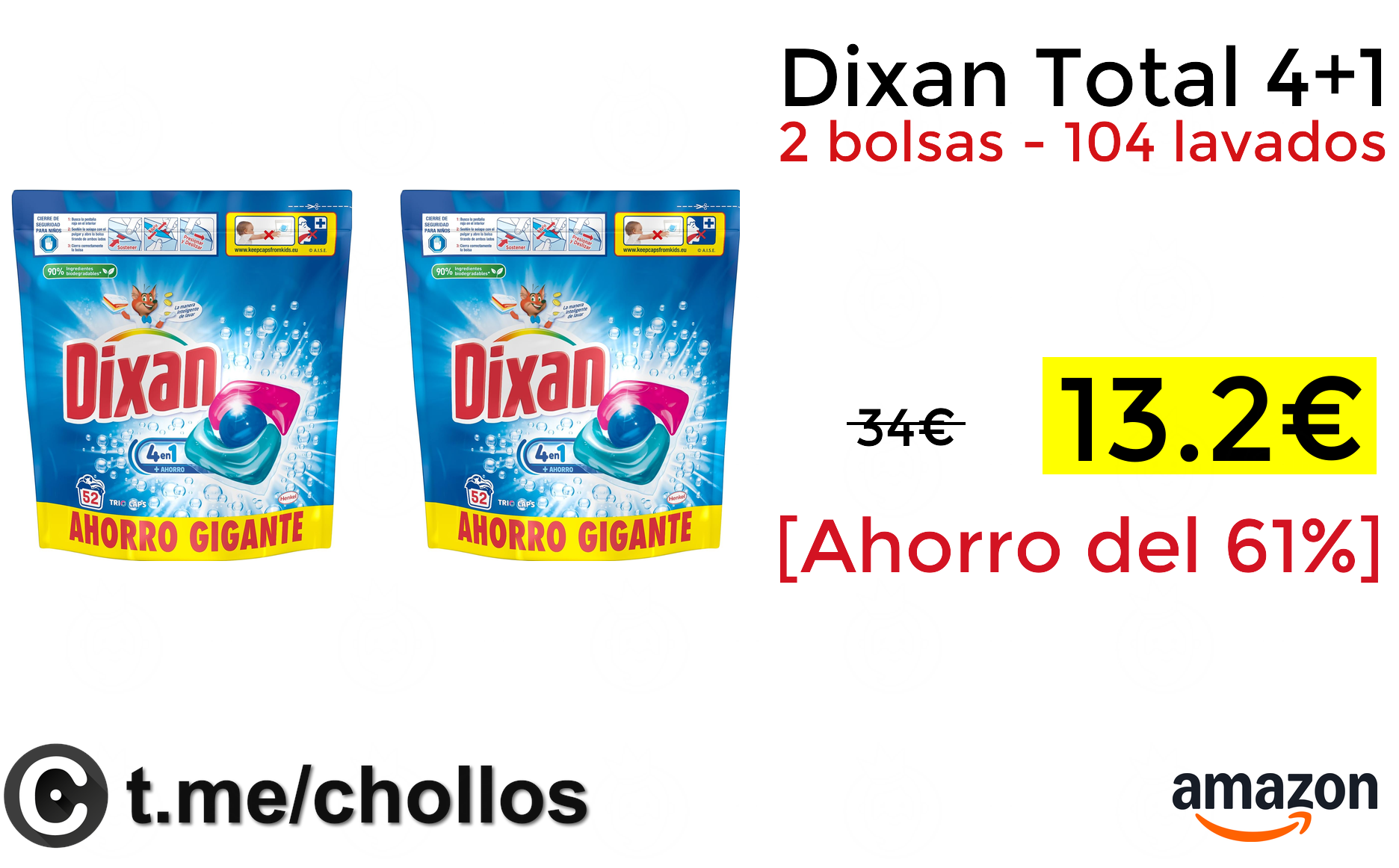 🔹Dixan Total 4+1 2 bolsas - 104 lavados solo 13.2€❗️💥 (PVP: +34€)