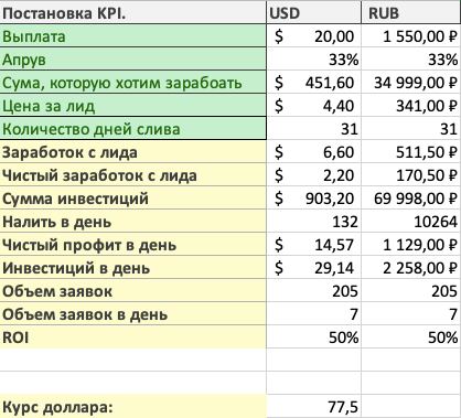Я знаю, что многие рассматривают арбитраж как альтернативу работе по найму. Я нашел свою старую таблицу для постановки KPI (целей по заработку) и посчитал необходимый объем лидов и вложений для заработка этой суммы. Расчеты прикрепил скрином к этому посту.