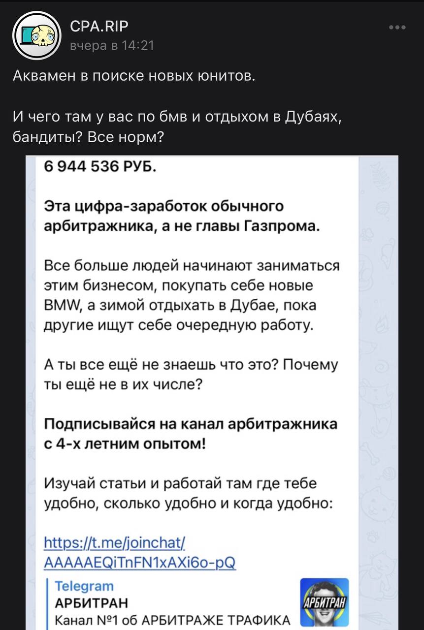 А можно заливаться постом как на скрине и подписчик будет в разы дешевле, но это не будут сливки арбитражного общества или топы. Это будет аудитория, которая возможно ещё не знает, что такое арбитраж, но рекламный пост заставил ее перейти на канал.