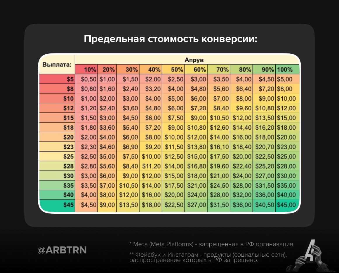 3. Найти в таблице, которую я прикрепил ниже, свою выплату и апрув - на пересечении посмотреть предельную стоимость конверсии