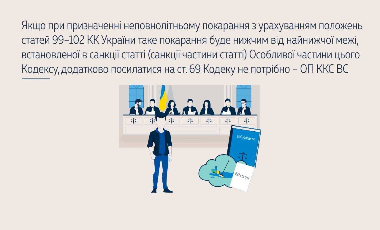 🔹ОП ККС ВС: якщо при призначенні неповнолітньому покарання з урахуванням положень статей 99–102 КК України таке покарання буде нижчим від найнижчої межі, встановленої в санкції статті (санкції частини статті) Особливої частини цього Кодексу, додатково посилатися на ст. 69 Кодексу не потрібно