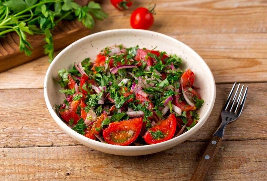 3. Зелень мелко нарубите и добавьте к помидорам. Добавьте туда же лук с заправкой. Все хорошо перемешайте и дайте салату минут 5 настояться.