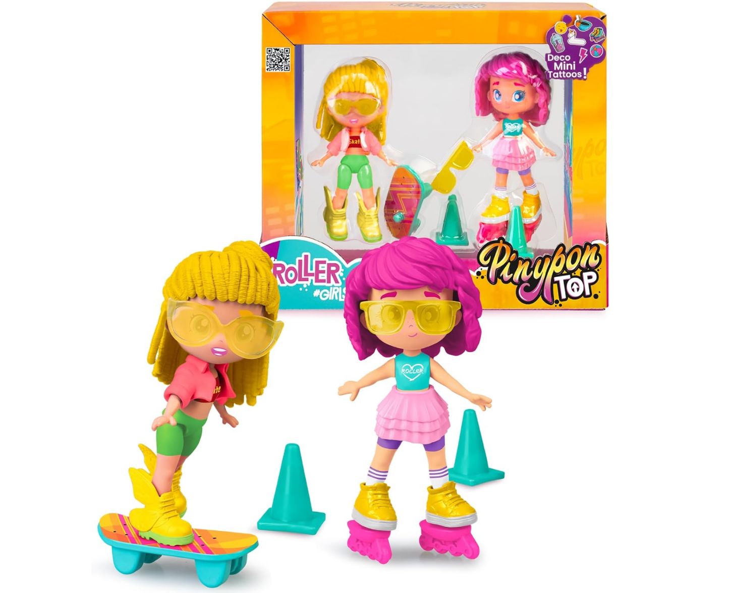 ✨ Set de 2 Chicas sobre Ruedas, 1 con Patines y 1 con Monopatín, Figuras Articuladas de Brazos y Piernas, Ropa y Zapatos Intercambiables, Incluye Accesorios