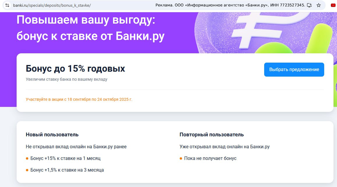 Бонус за первый вклад, открытый через маркетплейс "Банки ру". Акцию продлили до 24 октября.