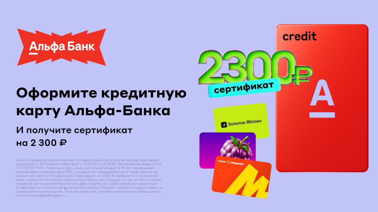 Сертификат на 2300 руб. в Яндекс Маркет/Wildberries/Золотое Яблоко за кредитную карту "Альфа-Банка" со снятием наличных и кэшбэком. Акция до конца октября. А кому-то банк в приложении предлагает оформить вторую кредитку.