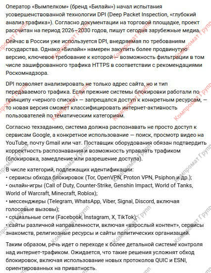 «Вымпелком» уже начал испытания усовершенствованной системы DPI, ориентированной на фильтрацию зашифрованного HTTPS-трафика. В документах прямо указывается: решения должны соответствовать требованиям Роскомнадзора и обеспечивать возможность блокировки, замедления или выборочного разрешения доступа. Иными словами, речь идет о прямом вмешательстве в любую активность пользователей.