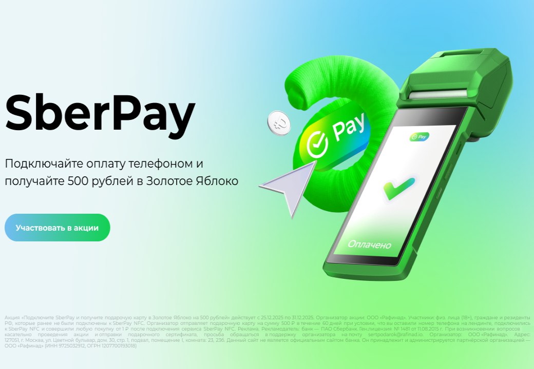 Подключите SberPay NFC и получите сертификат на 500 ₽ в «Золотое яблоко».