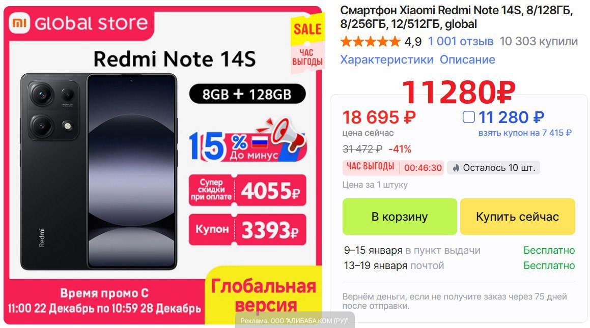 • AliExpress - смартфон Xiaomi Redmi Note 14S за 11280р: