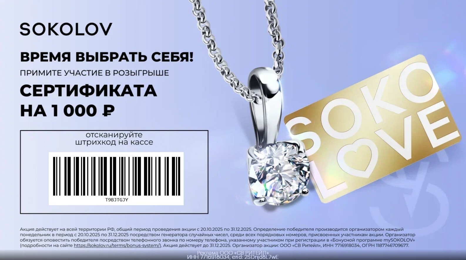 Приходи в любой розничный магазин SOKOLOV до конца месяца, покажи штрихкод из акции и получи серебряную подвеску бесплатно! А ещё автоматически станешь участником еженедельном розыгрыше 1000р.
